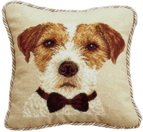 A portrait of a Jack Russell complete with bow tie. This small needlepoint 12″ x 12″ pillow makes for a great size to tuck into a chair.