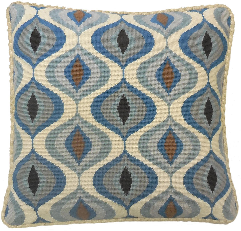 At first glance, you might not notice the complexity of this needlepoint pillow due to the muted blue tones, but upon closer observation, you can really notice the beauty, shape, and movement created by the contrast of dark and light nude tones as well as pops of beige, and by the sleek curves of the lines. This pillow will add movement and life to any room in your home. (19”x19”)